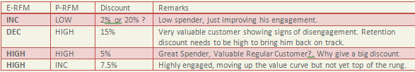 - Move :the E-RFM / P-RFM scores into the Marketing Platform as Customer Attributes. You can move the associated discounts into the database or manage the discount banners as personalized content.