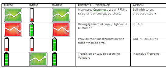 Retention for eg can be driven by measuring sudden drop in E-RFM and the relevant strategy directed by P-RFM. A sudden drop in E-RFM indicates a disinterest or lack of satisfaction that marketers can tackle better on a “point in time” basis rather than post facto. This really points to a potential future drop in P-RFM indicating that you could lose the customer. Obviously , a marketer would treat a valued customer’s engagement drop very differently from a first time consumers’ . Some interesting use cases have been listed below to indicate the interplay of data elements and how marketers can take advantage of subtle changes in behavior to acquire, improve sales uplift and retain customers.